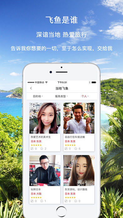 飞鱼是飞鱼旅行全世界搜罗的好玩的当地华人,他们身份不同,爱好多样,利用碎片化时间,入驻飞鱼旅行成为“飞鱼”,像朋友一样带您发掘全世界各地独特的生活体验。目前,飞鱼旅行吸引了日本、新西兰、澳大利亚、东南亚1000余名飞鱼入驻,未来,平台将招募更多国家和地区的飞鱼入驻,为用户提供更多国家和地区的独特生活体验。