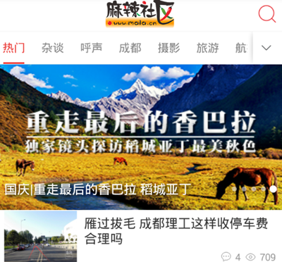 麻辣社区(www.mala.cn) 创办于2003年7月,是以四川本地话题讨论为核心,集时评、资讯、休闲为一体的综合性、特色化SNS网络社区。下设《群众呼声》、《麻辣杂谈》、《大话四川》、《麻辣摄影》、《中国川剧》等300多个本地化、特色化子论坛,同时拥有麻辣巧遇、微博、空间、相册、游戏、圈子等功能。