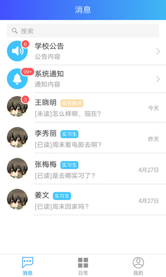 本系统为解决目前职业院校实习过程中遇到的实习难、管理难、实习任务完成率低等问题而开发。通过移动端、web后台,可实现老师、学生、企业导师之间即时通讯聊天、地图实时汇报位置、日志随时随地提交、通知即时到达、作业及时下发多渠道信息交叉互动,使院系、教师、企业、学生之间能够进行即时沟通,解决了实习中联络不畅、管理不实等问题。
