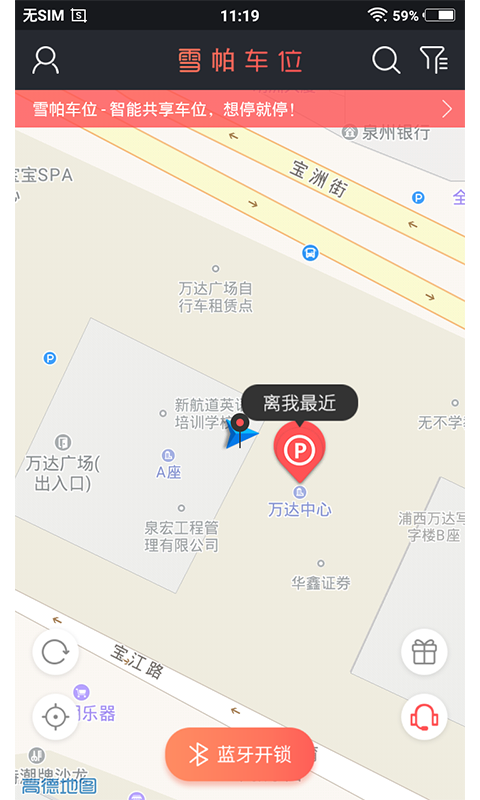 2、附近查询,帮助你找到附近哪里有停车的地方;