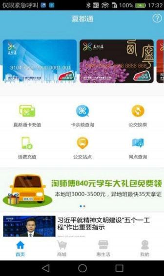 1、公交卡充值:在首页点击夏都通充值,选择充值金额后进行支付,根据提示将夏都通卡贴到图示位置后即可完成充值。