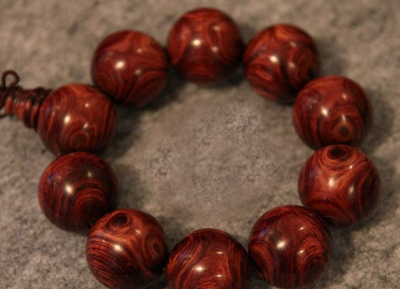 紫檀柳密度大,会沉水,而海南黄花梨大部分是不沉水的,两者重量差距明显,所以不可以此为唯一标准鉴别。(注:海黄15mm*15粒的克重约25g左右;18mm*13粒的克重约35g左右;20mm*12粒的克重约45g左右,提醒海黄爱好者购买海黄佛珠手串时一定要确认一下重量。)