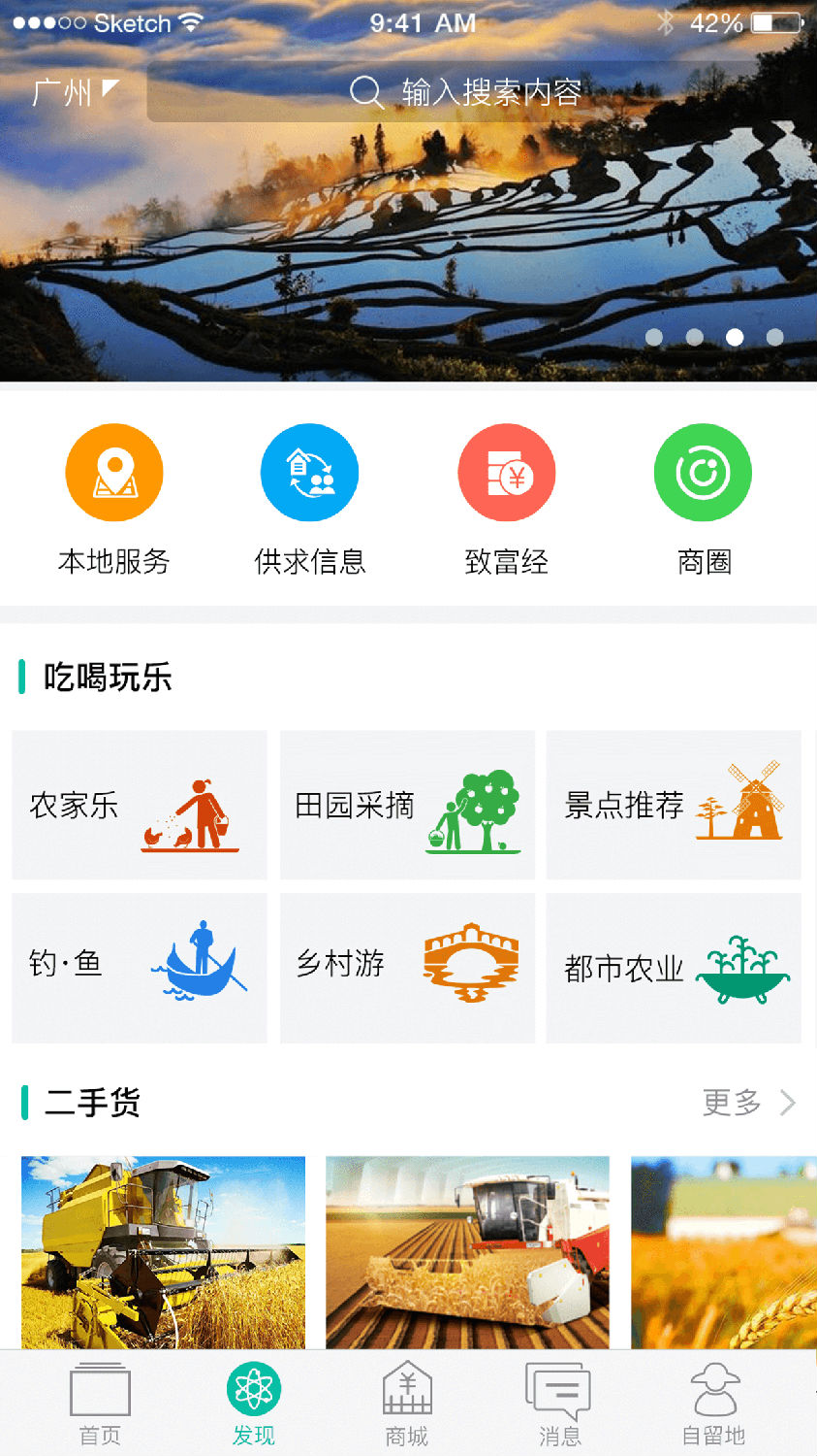 二是社区服务功能,提供周边的招工、特卖信息,用户可以发布信息服务,也可以获取生活配送、家电维修、水电服务等,还可以获取全国农产品的供求信息,同乡之间还可以建立商圈,获取致富信息。