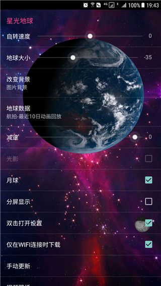 一款以星空为背景的地球动态壁纸。自动同步更新实时数据(最近10日)。多种动态星空背景和地球模式选择,支持手势旋转和摆放地球(单指转动双指移动三指上下滑动更新地球数据或更换背景图片)。