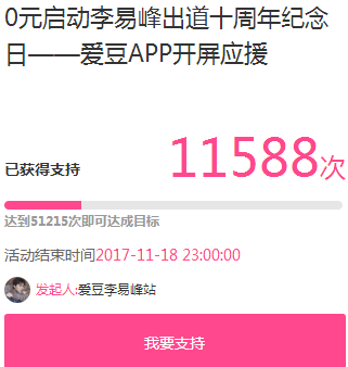 大家在app中找到李易峰主页后点击进入活动‘支持’按钮;或者是在app底端找到‘0元启动1215李易峰出道十周年纪念日-爱豆APP开屏应援活动’后进入页面点击‘支持’