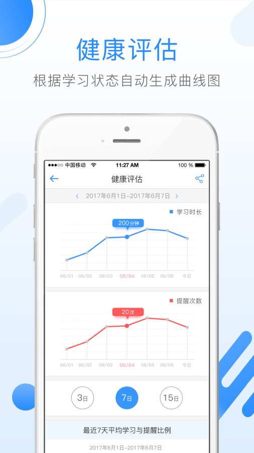 2、健康评估,根据学习状态自动生成曲线图!