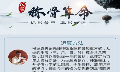 称骨算命是唐代的星象预测家袁天罡称骨的预测方法. 称骨算命同四柱算命一样,能推算一个人一生的吉凶祸福,荣辱盛衰,便于掌握和运用.排出八字,大运,找出神煞,胎元,命宫,岁运并临等信息.