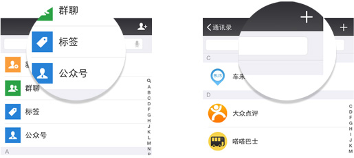 1、打开微信,进入通讯录,点击“公众号”,然后点击右上角的“+”。