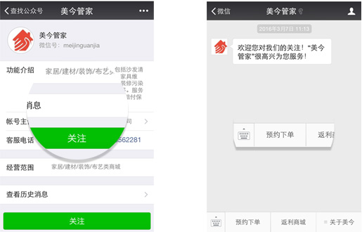 3、点击“关注”,即成功关注“美今管家”平台,即可在个人的微信列表里随时收到“美今管家”平台发送的信息。点击右下图“预约下单”