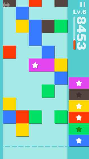 1、屏幕中有彩色方块在下落,下方面有彩色方块按钮,点击屏幕中的颜色,即可消除,不要让彩色方块掉落到虚线底部。