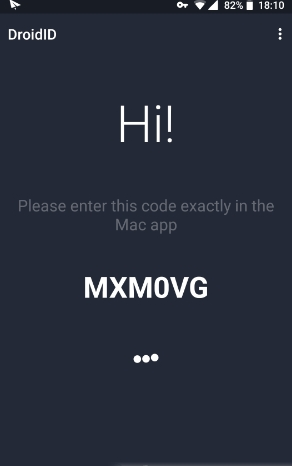 DroidID配置起来十分简单。分别在Android端和macOS端安装好后,首次在手机上打开DroidID,它会显示一个随机生成的代码: