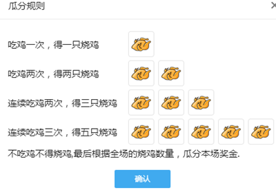 不吃鸡不得烧鸡,最后根据全场的烧鸡数量,瓜分本场奖金.