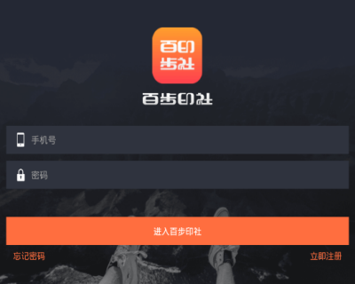 1、下载安装百步印社app,点击进入登录注册界面,选择立即注册进行注册,如下图: