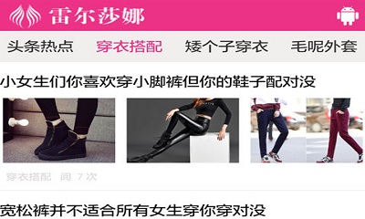 雷尔莎娜是一款教你如何穿衣搭配的资讯应用,这里有海量达人朋友分享的穿衣搭配攻略,有头条热点,穿衣搭配,矮个子穿衣和毛妮外套等等分类,总有适合你的,让您眼前一亮的穿衣搭配,让你拍案叫绝的搭配技巧,快来改善改善穿衣风格吧。