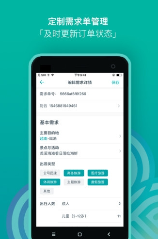 这款APP主要针对【定制游行业高频询单】的需求,销售/旅行顾问/旅行定制师等可通过此APP记录客人定制需求,快速生成需求单,协同给操作人员。帮助旅行机构提升内部沟通效率,增加询单转化率。