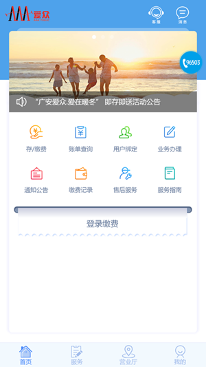 掌上爱众App官网客户单端上线了,一款专门针对于四川广安地区打造的综合性服务平台,集合了水电费缴纳,账单查询,业务办理,服务指南等一站式服务内容,致力于帮助用户们线上缴费,账单查询,享受最便捷的生活服务!