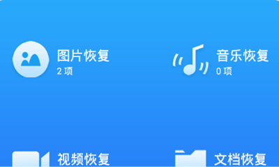 打开APP,呈现出图片,音乐,视频和文档四类文件分类;恢复误删文件,包括音频、视频、图片、Word文件、Excel文件,PPT文件文本文件、压缩文件、PDF文件。
