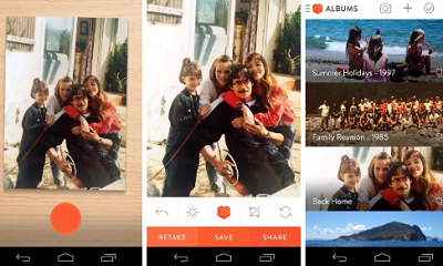 Heirloom设计简洁清新,翻拍过程也很省事:不用像大家常用的名片识别app那样小心翼翼地对准位置,把照片完整放入到取景框里即可,无论横、竖、斜放都行,咔嚓之后,照片就自动被切边、摆正了,方便的很。拍完后提供简单的照片编辑工具,点“SAVE”即宣告完工。