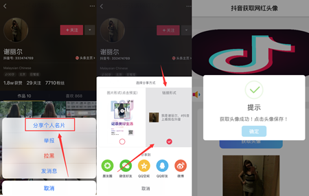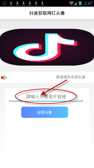 将获取的作者名片链接粘贴至下面的圆框内,点击获取头像就可以直接获取你自己喜欢的抖音网红头像了哦!