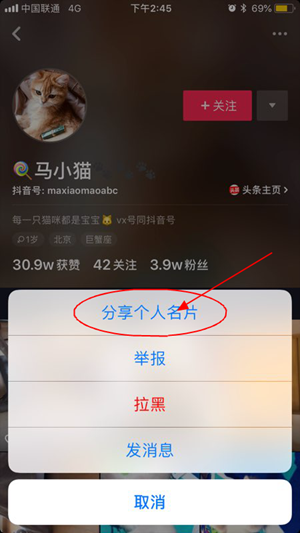 首先大家喜欢在抖音中找到自己喜欢的抖音用户,通过右上角的功能按钮选择软件的“分享个人名片”功能!