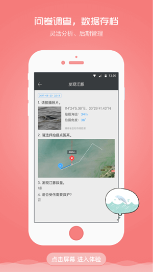 “江豚管家”将自动记录巡护航行的轨迹,半自动记录发现受伤江豚、非法渔业等事件,也可以通过手机看到护渔员是否在工作,并随时进行电子记录。