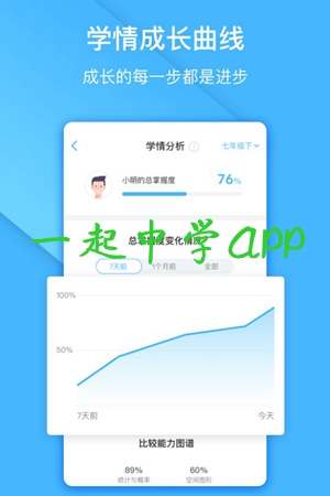 学情分析:绘制孩子成长曲线,关注每一次进步。分析孩子各知识点掌握情况,了解与平均水平的差异,针对性补弱增强。
