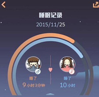 记录两个人的睡眠记录用柱状图的形式表现出来,睡眠时长一目了然,让情侣们能从睡眠状况方面关心到另一半