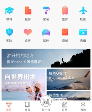 3、提供教育、租房、家装、购物、汽车、旅游、机票、婚庆、车险、驾校等多个场景消费服务。