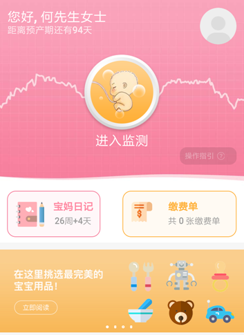 孕妇可以使用韵宝宝孕妇端APP通过蓝牙或WIFI连接对应的韵宝宝胎监设备并做胎监。做胎监时可在APP上实时看到胎心率曲线以及胎动信息,胎监数据会存在云端,安全可靠,胎监结束后可以在胎监详情里看胎心率曲线以及播放胎心音,并可请求系统分析以及诊断和判图。孕妇可在韵宝宝孕妇端APP上购买套餐、租用设备、连接设备,进行胎监、请求系统分析以及诊断和判图、设备归还、查看胎监详情,查看孕妇相关知识等。