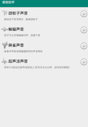 驱蚊助手是一款非常实用的生活小工具,有了这款app,用手机就可以驱蚊,手机就变成电子蚊香啦。