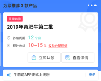 牛萌萌会把整个养牛过程完全呈现在用户面前,让你每天都看得到你的牛(你的钱) 在哪里,经过一个育肥周期,实现养牛的利润和我们的管理费,完完全全在你眼皮子底下赚钱。
