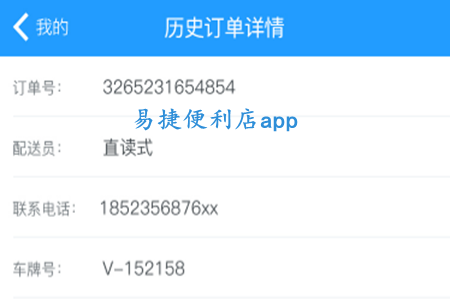 查看订单详情,包括订单号、配送员、车牌号、联系电话等信息;