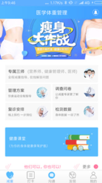 医学体重管理APP 是一款服务于用户体重管理的APP,医学体重管理APP针对体重数据方面能检测到实时的体脂变化,对于健身期间或者减脂期间的人来说,这款软件还是非常好用的