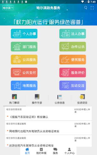 哈尔滨政务服务包含网上事项申报,公共服务,便民服务,公共支付,“不见面”审批等多功能于一体的移动端政务服务申报平台。可以让行政相对人随时随地的进行事项申报,查询事项状态,对事项进行补正等多项功能,为社会公众提供一体化,高效的移动互联网政务服务平台。