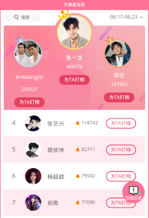 芒果星饭团app是一款专门服务于粉丝的应援打榜平台,在这里不仅可以实时了解到各个明星的最近资讯动态,以及行程计划,同时还能够为自己的爱豆实时打榜,以及查看榜单,与网友们参与各种实时热点话题,爱他就来为他打call吧!