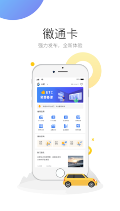 徽通卡APP为高速公路用户徽通卡配套服务,包括ETC办理、ETC激活、ETC充值、ETC查询、高速公路资讯、客服等功能。