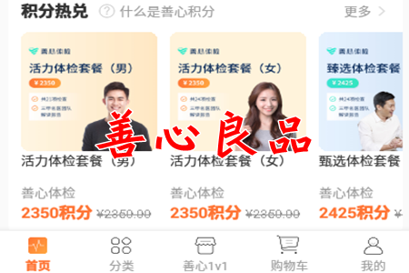 善心良品让大家可以通过这里来找到非常方便的体检服务,通过app来了解相关的体检套餐。获得的积分能够兑换各种奖励,积分商城中有海量的商品种类,让你可以获得更多的优惠福利。