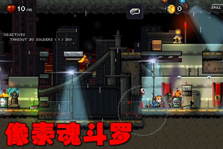 像素魂斗罗是一款非常好玩并且十分刺激的射击游戏。在这款游戏里玩家你要操控你的人物在这个像素世界里进行战斗,使用人物手中的武器去消灭敌人的同时你要通过跳跃和移动去躲避敌人的攻击,让你的人物在这个世界里四处冒险,成功完成关卡挑战。