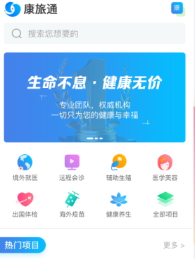 康旅通对接全球优质医疗资源,在医疗资源供求环境中挖掘“增量价值”,为用户私人定制多元、优质、高效、便捷,具有性价比的跨境医疗旅游解决方案。包括远程问诊、出国看病、跨境体检、医疗美容、陪同翻译等全程一站式服务。旨为让客户在享受世界各地旅行的乐趣的同时也享受全球便捷、优质的医疗与健康服务。