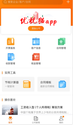 优税猫是一款税务筹划APP,可以帮助企业及高收入人群解决税务难题,系统以大数据为依托,园区为纽带,融合互联网技术,为用户打造一站式税务筹划服务平台