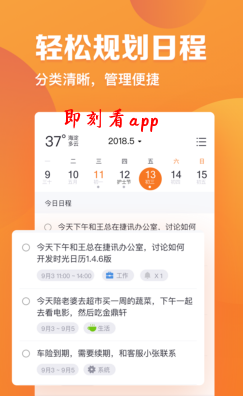 即刻看app让你的时间更有价值,一款专为大众打造的时间管理平台,为你有效的规划每天的生活,工作时间,自定义每天要做的事情,为你智能生成日程规划表,智能提醒,陪伴你见证每一个习惯养成的过程,成为更好的自己!