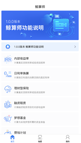 鲸算师APP中有多种计算功能供大家使用,内部收益计算器/日利率换算/理财型保险计算器等等,能够非常快速详细的为大家啊计算出结果。不管你是日常攒钱还是投资保险等都能为你提供很好的服务。