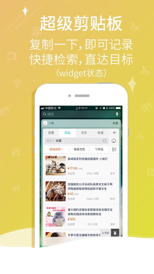 一知碎片信息管理分享平台,收藏信息统一管理,复制信息便捷检索,加入强大的聚宝窗功能,用户可在桌面点击聚宝窗进行内容快速收藏、快速笔记操作及智能抢红包,实现了用户能在应用外直接完成对功能的使用,特别是针对链接的收藏,这无论是在用户体验上还是技术上都是一次重大突破。