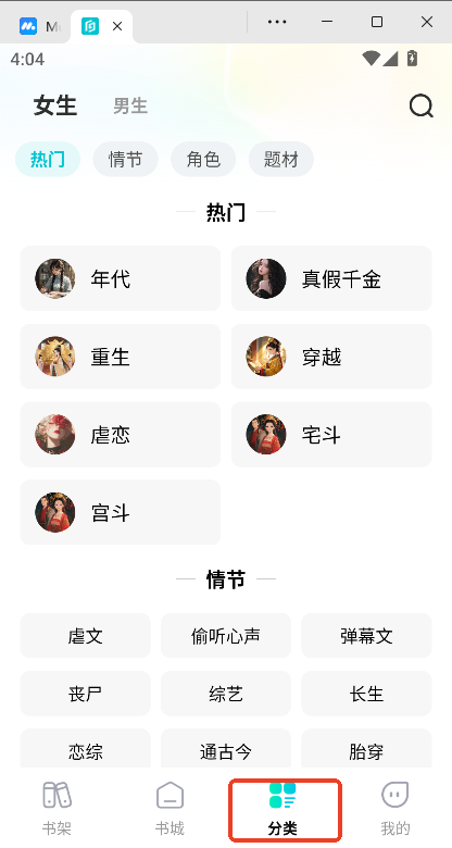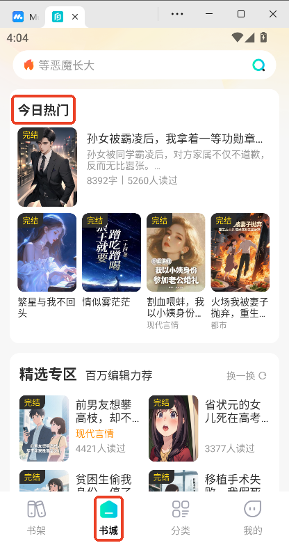 简洁界面设计:首页布局简洁,无冗余信息,底部“书架”“书城”“分类”“我的”四大核心板块一目了然,图标设计清晰易懂。书城界面展示清晰,新书推荐、热门专区划分明确,操作方便,新用户也能快速上手,减少学习成本。