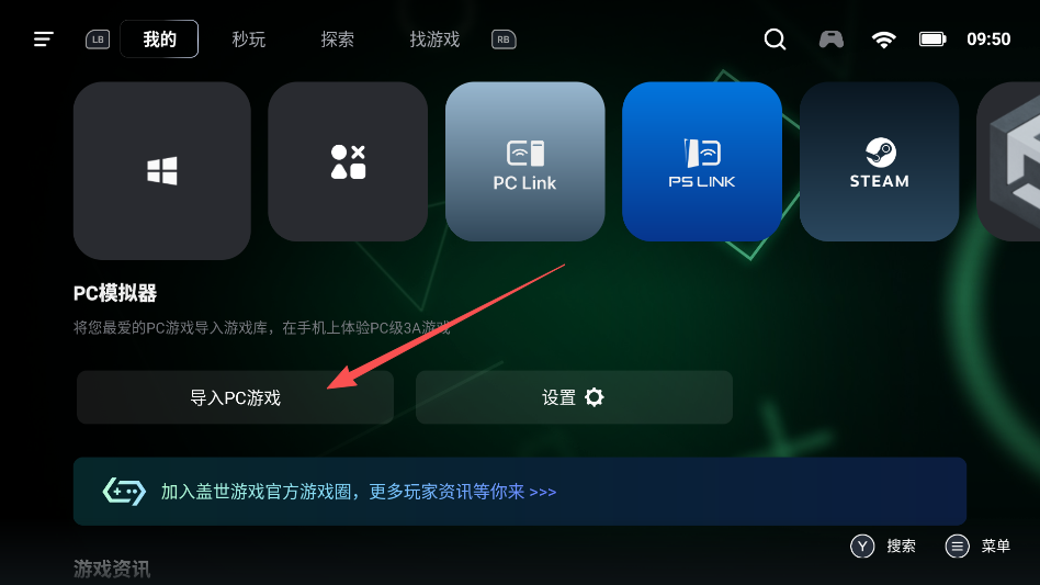 然后打开盖世游戏app,进入主页后点击左上角我的
