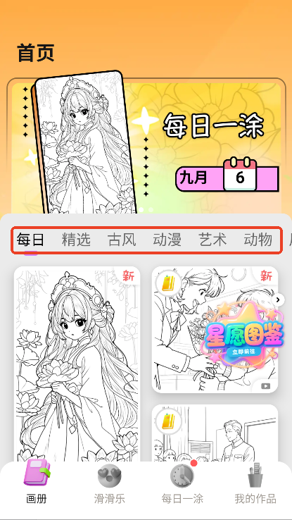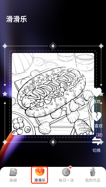 轻量化附加功能矩阵:除核心美化功能外,包含星愿图鉴、滑滑乐、每日一涂等休闲板块,用户可查看“已完成 / 喜欢的涂色作品”,同时提供终身免费畅玩等福利解锁机制,平衡免费体验与功能完整性。