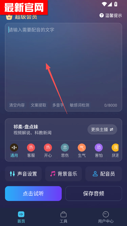 第一个主打亮点是“零门槛操作,新手秒上手”。很多配音软件需要学习音轨编辑、混音等专业操作,而“掌上配音”完全不用。不用懂任何专业术语,只要会打字、会点屏幕,就能完成配音。比如给孩子做睡前故事配音,输入故事文字,选个温柔的女声,点生成就能用,几分钟就搞定,对新手特别友好。