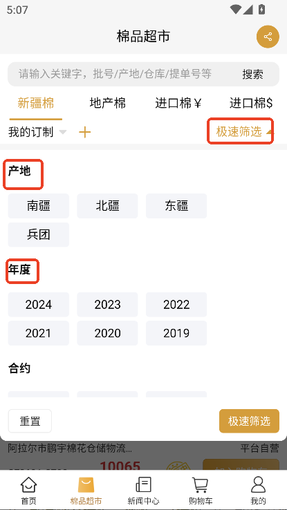 智能交易:提供棉品超市,具备强大的筛选与搜索功能,可按批号、产地、仓库、提单号等关键字精准检索,还能通过长度强力、马值等质量参数范围筛选商品,满足不同用户的采购需求。
