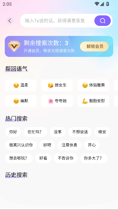 海量话术资源:拥有覆盖恋爱、职场、社交等各类场景的庞大话术库,每日新增超千条内容,确保话术紧跟网络潮流和实时热点。像恋爱板块包含从相识初期的破冰话术,到热恋期的甜蜜情话,再到争吵时的和解话术等一应俱全,还会根据节日更新专属话术,如情人节表白语。