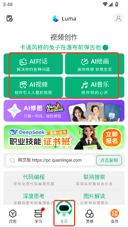 全灵AI安卓正式版下载是一款便捷实用的多功能AI内容创作辅助工具,提供AI对话绘画,AI视频音乐,文生图文生视频,代码生成,深度思考,全网搜索等便捷功能,涵盖丰富的分类领域创作辅助与智能AI助力实时对话,还能获取热门的AI自学课程,助力快速上手,多样化的灵感素材帮助用户快速制作同款,满足不同用户的使用需求。